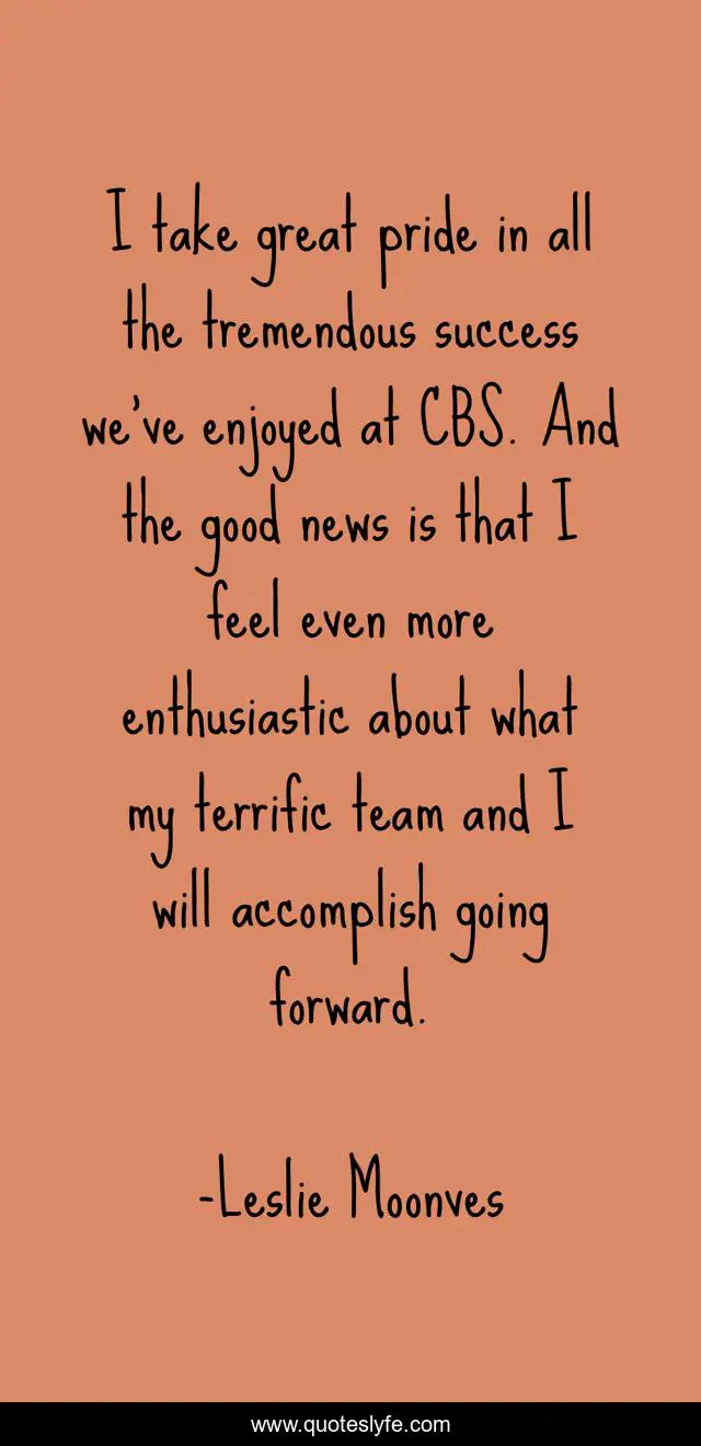 This page presents the quote "I take great pride in all the tremendous success we've enjoyed at CBS. And the good news is that I feel even more enthusiastic about what my terrific team and I will accomplish going forward.". Author of this quote is Leslie Moonves. This quote is about great, good, team,.