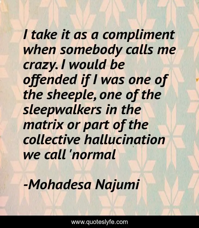 I take it as a compliment when somebody calls me crazy. I would be offended if I was one of the sheeple, one of the sleepwalkers in the matrix or part of the collective hallucination we call 'normal
