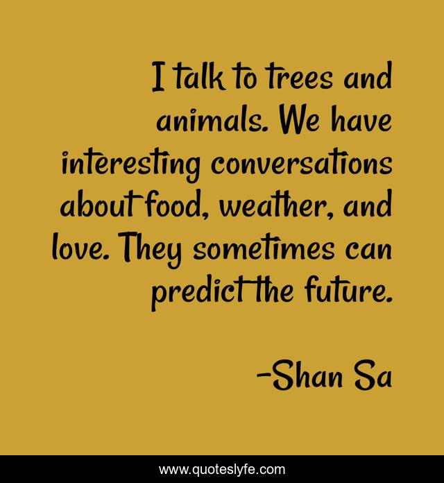 This page presents the quote "I talk to trees and animals. We have interesting conversations about food, weather, and love. They sometimes can predict the future.". Author of this quote is Shan Sa. This quote is about future, love, trees, affection,.