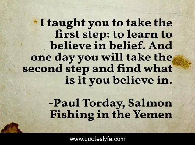 This page presents the quote "I taught you to take the first step: to learn to believe in belief. And one day you will take the second step and find what is it you believe in.". Author of this quote is Paul Torday, Salmon Fishing in the Yemen. This quote is about fishing, belief, wisdom,.