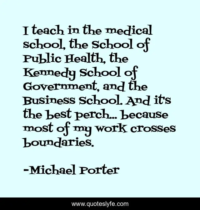 This page presents the quote "I teach in the medical school, the School of Public Health, the Kennedy School of Government, and the Business School. And it's the best perch... because most of my work crosses boundaries.". Author of this quote is Michael Porter. This quote is about work, health, business,.
