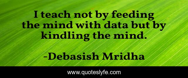 This page presents the quote "I teach not by feeding the mind with data but by kindling the mind.". Author of this quote is Debasish Mridha. This quote is about miraboli, oscar-wilde, philosophy, debasish-mridha, tagore, feeding-the-mind, quotes, buddha, debasish-mridha-md,.