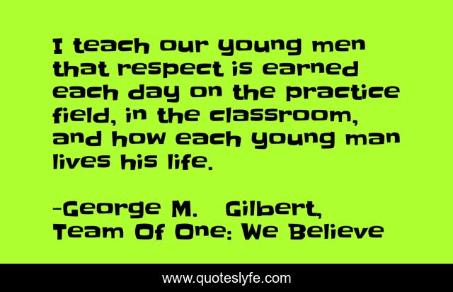 This page presents the quote "I teach our young men that respect is earned each day on the practice field, in the classroom, and how each young man lives his life.". Author of this quote is George M. Gilbert, Team Of One: We Believe. This quote is about team-direction, confidence, football, success, positive, motivational, winning, coaching, optimistic,.