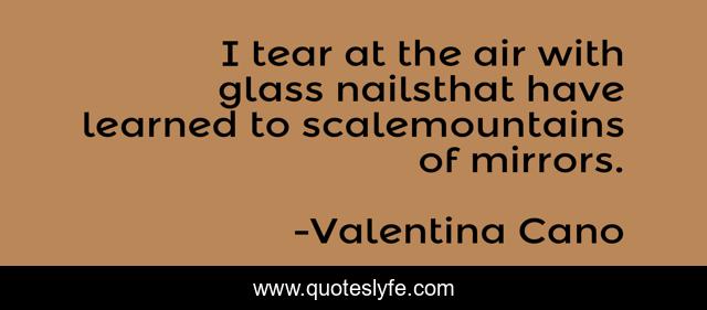 This page presents the quote "I tear at the air with glass nailsthat have learned to scalemountains of mirrors.". Author of this quote is Valentina Cano. This quote is about sadness, depression,.