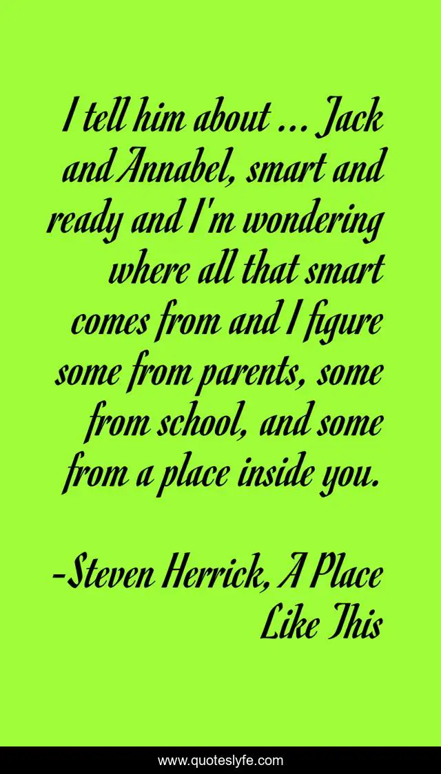 This page presents the quote "I tell him about ... Jack and Annabel, smart and ready and I'm wondering where all that smart comes from and I figure some from parents, some from school, and some from a place inside you.". Author of this quote is Steven Herrick, A Place Like This. This quote is about ready, a-place-inside-you, school, parents, smart,.