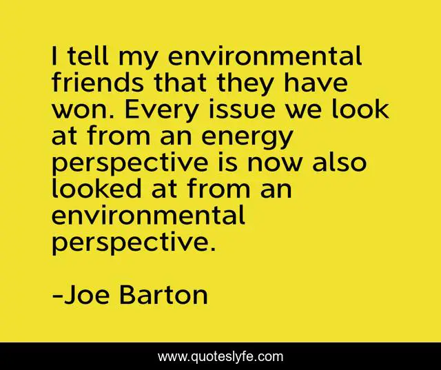This page presents the quote "I tell my environmental friends that they have won. Every issue we look at from an energy perspective is now also looked at from an environmental perspective.". Author of this quote is Joe Barton. This quote is about energy, friends, perspective,.