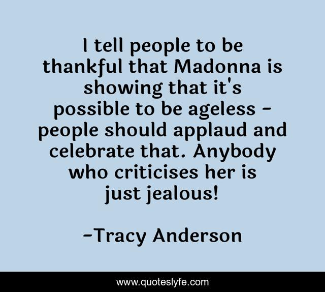 This page presents the quote "I tell people to be thankful that Madonna is showing that it's possible to be ageless - people should applaud and celebrate that. Anybody who criticises her is just jealous!". Author of this quote is Tracy Anderson. This quote is about celebrate, people,.
