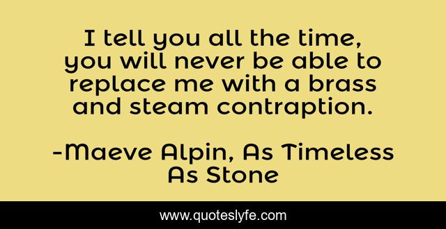 This page presents the quote "I tell you all the time, you will never be able to replace me with a brass and steam contraption.". Author of this quote is Maeve Alpin, As Timeless As Stone. This quote is about steampunk-romance, cornelia-amiri, steampunk, time-travel, romance, egyptian-steampunk, maeve-alpin, lyrical-press, erotica-romance,.