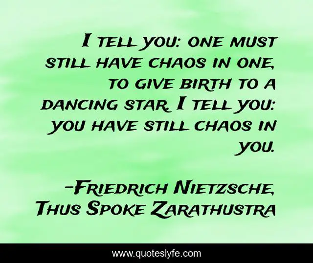 This page presents the quote "I tell you: one must still have chaos in one, to give birth to a dancing star. I tell you: you have still chaos in you.". Author of this quote is Friedrich Nietzsche, Thus Spoke Zarathustra. This quote is about philosophy, chaos,.