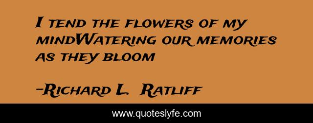 This page presents the quote "I tend the flowers of my mindWatering our memories as they bloom". Author of this quote is Richard L. Ratliff. This quote is about friendship, gardening, memories, watering, mind, love, flowers, bloom, affection,.