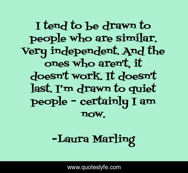This page presents the quote "I tend to be drawn to people who are similar. Very independent. And the ones who aren't, it doesn't work. It doesn't last. I’m drawn to quiet people – certainly I am now.". Author of this quote is Laura Marling. This quote is about life, inspirational, the-guardian, quote, laura-marling, short-movie, enthusiasm,.