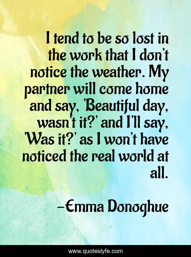 This page presents the quote "I tend to be so lost in the work that I don't notice the weather. My partner will come home and say, 'Beautiful day, wasn't it?' and I'll say, 'Was it?' as I won't have noticed the real world at all.". Author of this quote is Emma Donoghue. This quote is about beautiful, work, day,.