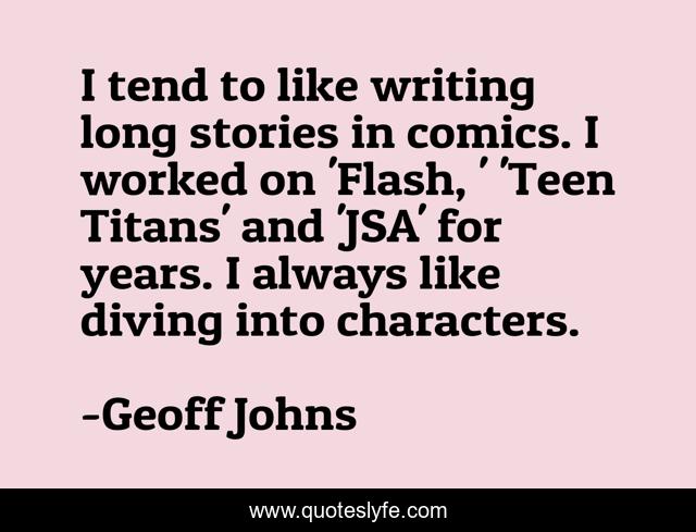 This page presents the quote "I tend to like writing long stories in comics. I worked on 'Flash, ' 'Teen Titans' and 'JSA' for years. I always like diving into characters.". Author of this quote is Geoff Johns. This quote is about writing, long, years,.