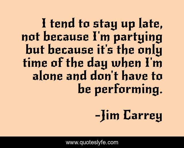 This page presents the quote "I tend to stay up late, not because I'm partying but because it's the only time of the day when I'm alone and don't have to be performing.". Author of this quote is Jim Carrey. This quote is about late, day, time,.