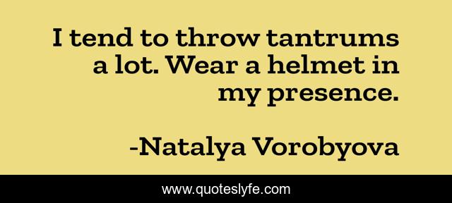 This page presents the quote "I tend to throw tantrums a lot. Wear a helmet in my presence.". Author of this quote is Natalya Vorobyova. This quote is about helmet, humour, anger-management, wordplay, behaviour, attitude, tantrums, wear, anger,.
