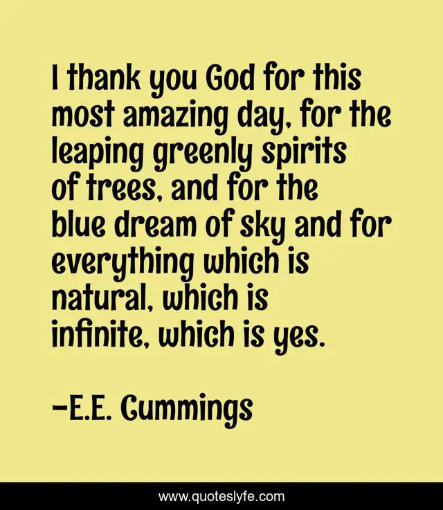 This page presents the quote "I thank you God for this most amazing day, for the leaping greenly spirits of trees, and for the blue dream of sky and for everything which is natural, which is infinite, which is yes.". Author of this quote is E.E. Cummings. This quote is about enthusiasm, inspirational,.
