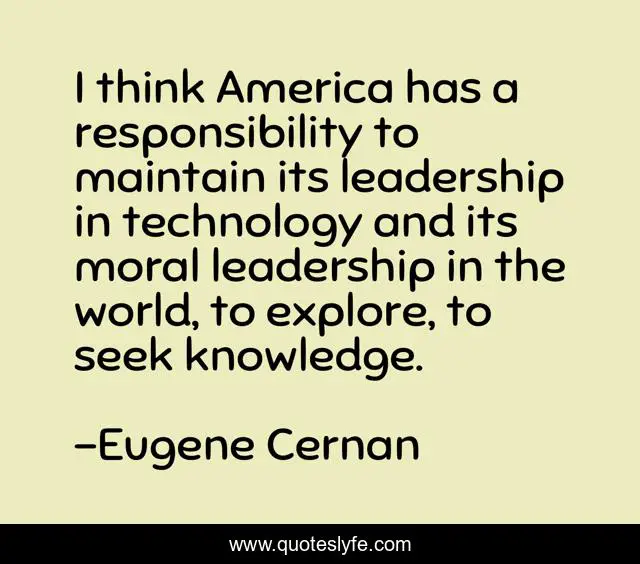 This page presents the quote "I think America has a responsibility to maintain its leadership in technology and its moral leadership in the world, to explore, to seek knowledge.". Author of this quote is Eugene Cernan. This quote is about leadership, technology,.
