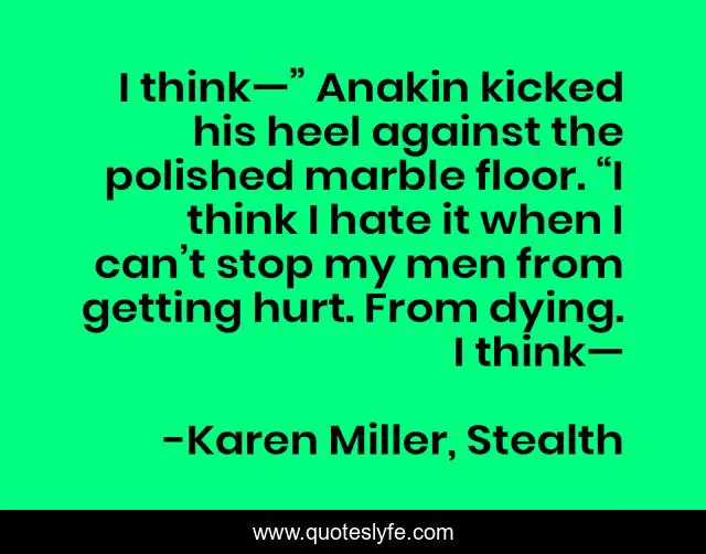 This page presents the quote "I think—” Anakin kicked his heel against the polished marble floor. “I think I hate it when I can’t stop my men from getting hurt. From dying. I think—". Author of this quote is Karen Miller, Stealth. This quote is about military, anakin-skywalker, clone-troopers, fear, star-wars,.