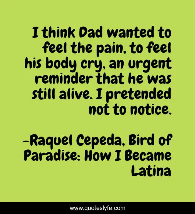This page presents the quote "I think Dad wanted to feel the pain, to feel his body cry, an urgent reminder that he was still alive. I pretended not to notice.". Author of this quote is Raquel Cepeda, Bird of Paradise: How I Became Latina. This quote is about father-and-daughter, father, pain, alive, mortality,.