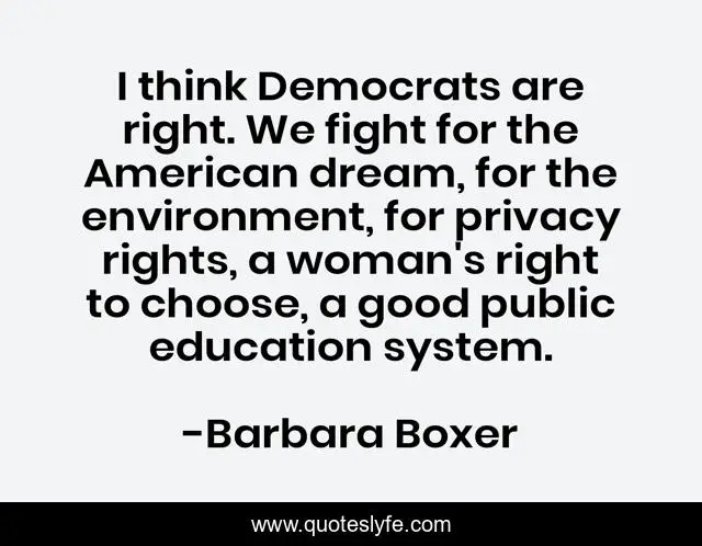 This page presents the quote "I think Democrats are right. We fight for the American dream, for the environment, for privacy rights, a woman's right to choose, a good public education system.". Author of this quote is Barbara Boxer. This quote is about american dream, good, woman,.