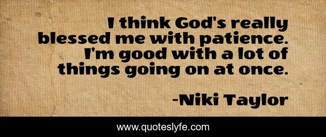 This page presents the quote "I think God's really blessed me with patience. I'm good with a lot of things going on at once.". Author of this quote is Niki Taylor. This quote is about god, good, blessed,.