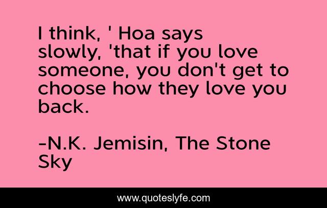 This page presents the quote "I think, ' Hoa says slowly, 'that if you love someone, you don't get to choose how they love you back.". Author of this quote is N.K. Jemisin, The Stone Sky. This quote is about love, affection,.