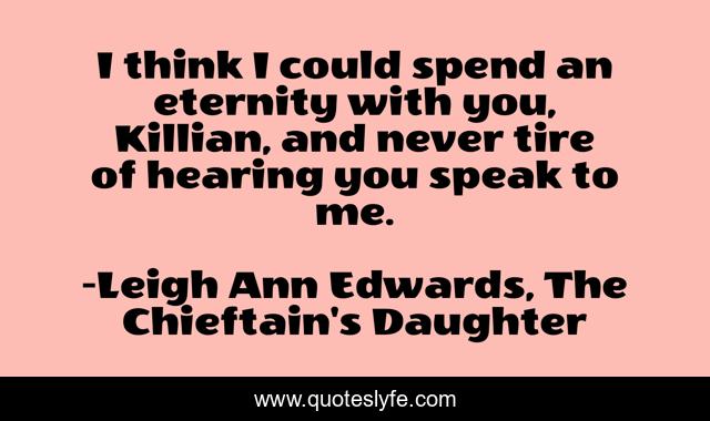 This page presents the quote "I think I could spend an eternity with you, Killian, and never tire of hearing you speak to me.". Author of this quote is Leigh Ann Edwards, The Chieftain's Daughter. This quote is about romance, fantasy, fairies, ireland, witch,.
