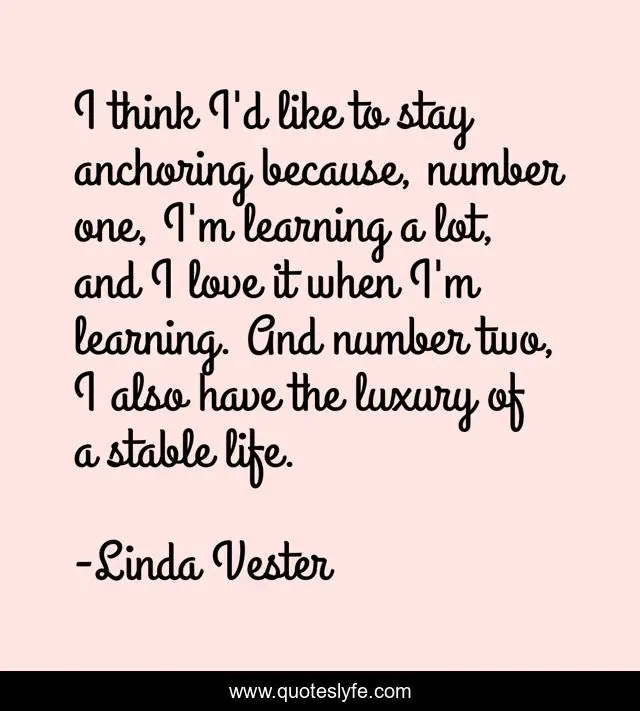 This page presents the quote "I think I'd like to stay anchoring because, number one, I'm learning a lot, and I love it when I'm learning. And number two, I also have the luxury of a stable life.". Author of this quote is Linda Vester. This quote is about life, love, think, affection,.