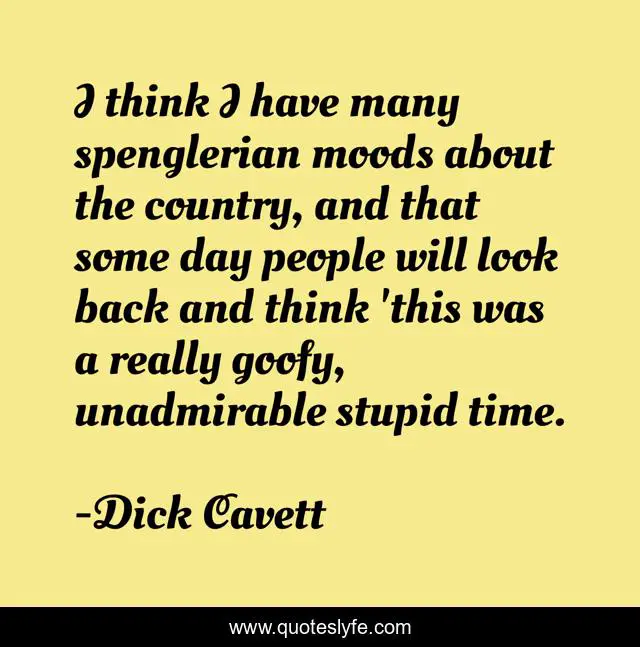 This page presents the quote "I think I have many spenglerian moods about the country, and that some day people will look back and think 'this was a really goofy, unadmirable stupid time.". Author of this quote is Dick Cavett. This quote is about cbc, country, q, stupid, time, interview, 21st-century, america, jian-gomeshi,.