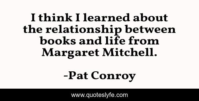 This page presents the quote "I think I learned about the relationship between books and life from Margaret Mitchell.". Author of this quote is Pat Conroy. This quote is about life, think, between,.