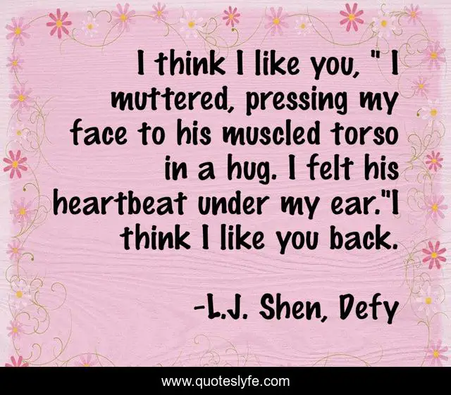 This page presents the quote "I think I like you, " I muttered, pressing my face to his muscled torso in a hug. I felt his heartbeat under my ear."I think I like you back.". Author of this quote is L.J. Shen, Defy. This quote is about new-adult, contemporary-romance, romance, forbidden-love, taboo, teacher-student, novella, erotica,.