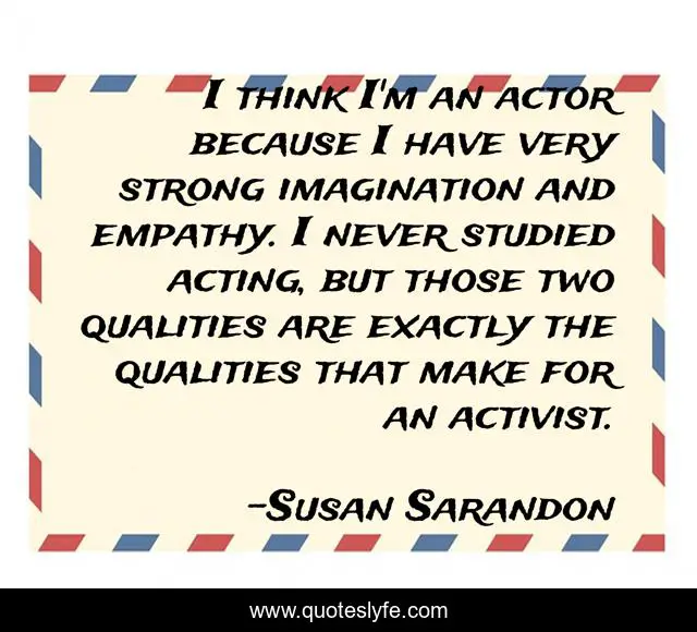 This page presents the quote "I think I'm an actor because I have very strong imagination and empathy. I never studied acting, but those two qualities are exactly the qualities that make for an activist.". Author of this quote is Susan Sarandon. This quote is about acting, empathy, activism,.