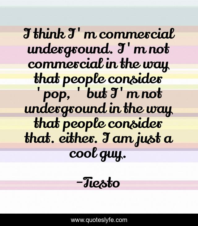 This page presents the quote "I think I'm commercial underground. I'm not commercial in the way that people consider 'pop, ' but I'm not underground in the way that people consider that. either. I am just a cool guy.". Author of this quote is Tiesto. This quote is about think, people,.