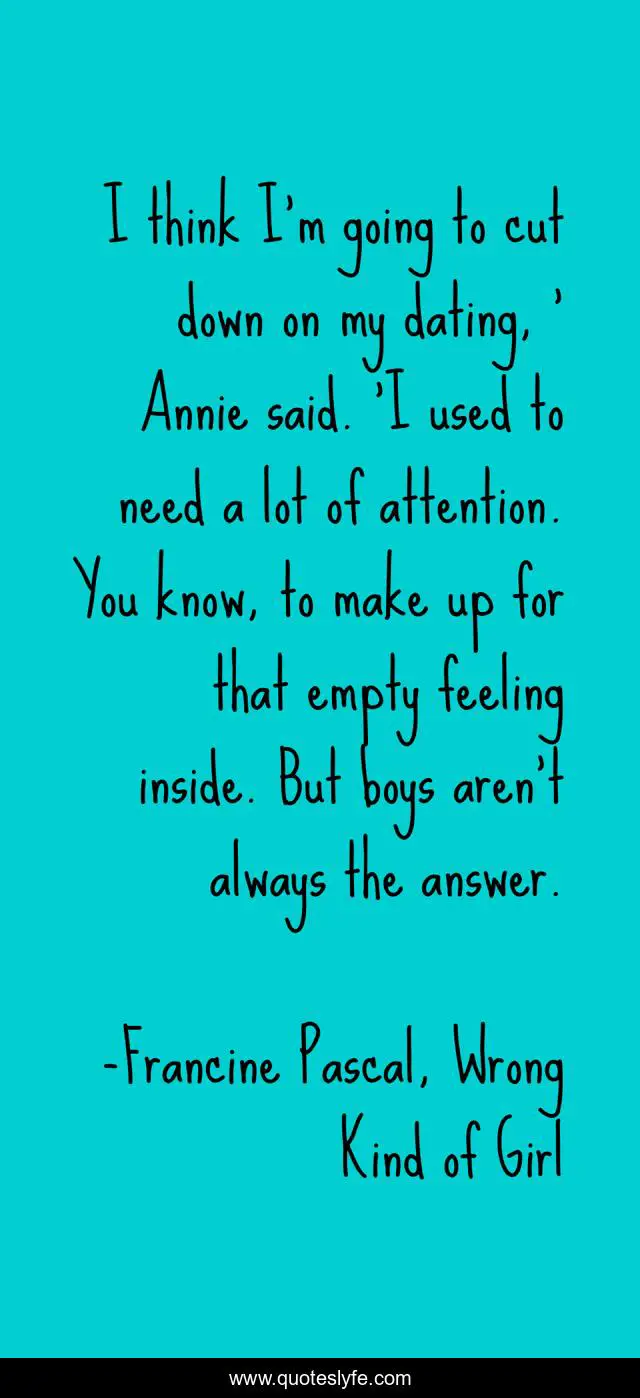 This page presents the quote "I think I’m going to cut down on my dating, ’ Annie said. ‘I used to need a lot of attention. You know, to make up for that empty feeling inside. But boys aren’t always the answer.". Author of this quote is Francine Pascal, Wrong Kind of Girl. This quote is about sweet-valley, boys, dating, empty,.