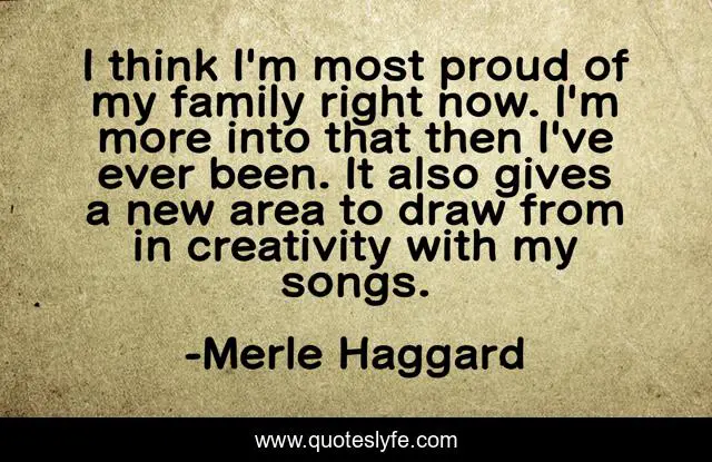 This page presents the quote "I think I'm most proud of my family right now. I'm more into that then I've ever been. It also gives a new area to draw from in creativity with my songs.". Author of this quote is Merle Haggard. This quote is about proud, creativity, think,.