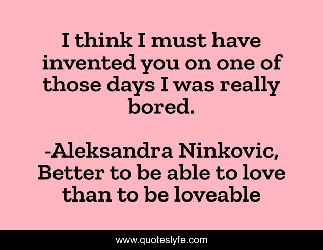 This page presents the quote "I think I must have invented you on one of those days I was really bored.". Author of this quote is Aleksandra Ninkovic, Better to be able to love than to be loveable. This quote is about relationships, love-and-sayings, days, invention, boredom, time, think,.