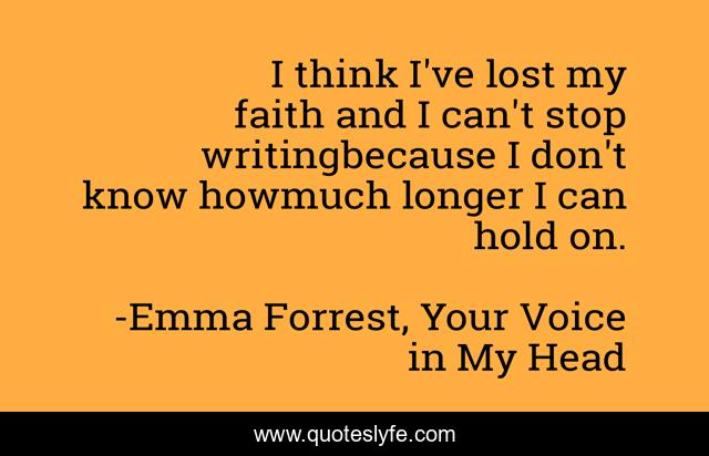 This page presents the quote "I think I've lost my faith and I can't stop writingbecause I don't know howmuch longer I can hold on.". Author of this quote is Emma Forrest, Your Voice in My Head. This quote is about depression, writing,.