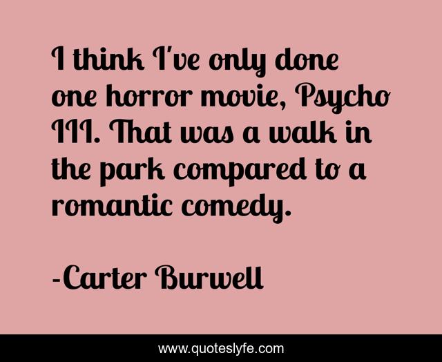 This page presents the quote "I think I've only done one horror movie, Psycho III. That was a walk in the park compared to a romantic comedy.". Author of this quote is Carter Burwell. This quote is about comedy, think, walk,.