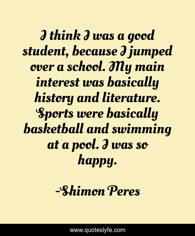 This page presents the quote "I think I was a good student, because I jumped over a school. My main interest was basically history and literature. Sports were basically basketball and swimming at a pool. I was so happy.". Author of this quote is Shimon Peres. This quote is about good, history, happy,.