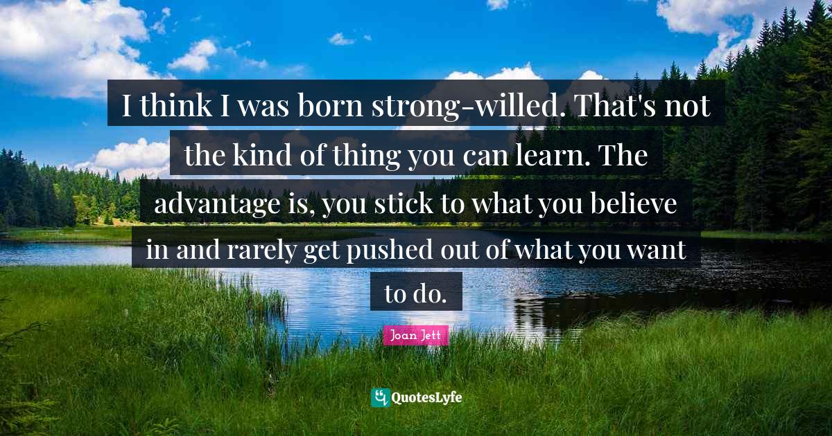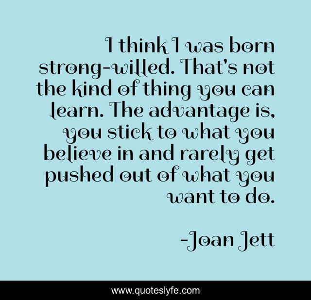 This page presents the quote "I think I was born strong-willed. That's not the kind of thing you can learn. The advantage is, you stick to what you believe in and rarely get pushed out of what you want to do.". Author of this quote is Joan Jett. This quote is about believe, think,.
