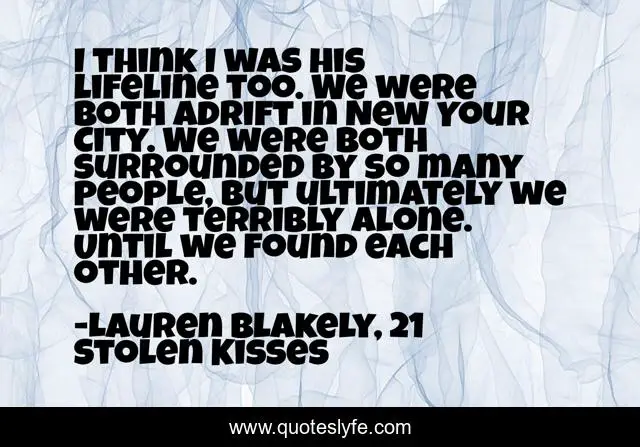 This page presents the quote "I think I was his lifeline too. We were both adrift in New Your City. We were both surrounded by so many people, but ultimately we were terribly alone. Until we found each other.". Author of this quote is Lauren Blakely, 21 Stolen Kisses. This quote is about lifeline, new-york-city,.