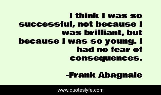 This page presents the quote "I think I was so successful, not because I was brilliant, but because I was so young. I had no fear of consequences.". Author of this quote is Frank Abagnale. This quote is about successful, think,.