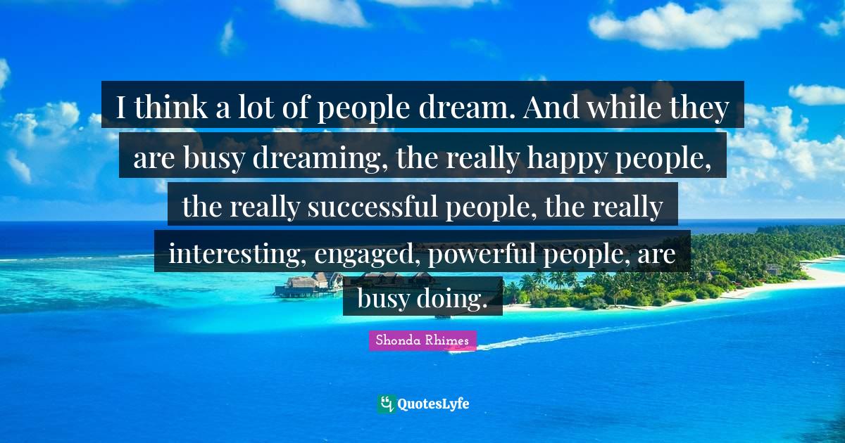 This page presents the quote "I think a lot of people dream. And while they are busy dreaming, the really happy people, the really successful people, the really interesting, engaged, powerful people, are busy doing.". Author of this quote is Shonda Rhimes. This quote is about engaged, dream, successful, people, busy, really interesting, really happy, successful people, powerful,.