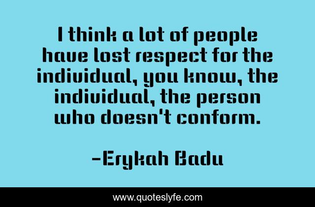 This page presents the quote "I think a lot of people have lost respect for the individual, you know, the individual, the person who doesn't conform.". Author of this quote is Erykah Badu. This quote is about lost, people,.