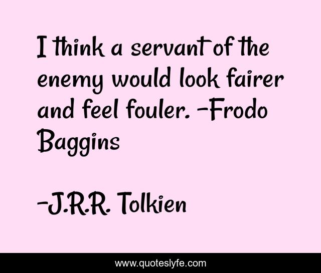 This page presents the quote "I think a servant of the enemy would look fairer and feel fouler. -Frodo Baggins". Author of this quote is J.R.R. Tolkien. This quote is about lord-of-the-rings, fantasy, lotr,.