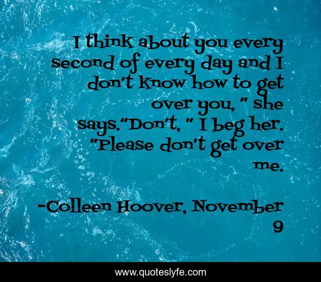 This page presents the quote "I think about you every second of every day and I don’t know how to get over you, ” she says.“Don’t, ” I beg her. “Please don’t get over me.". Author of this quote is Colleen Hoover, November 9. This quote is about love, affection,.