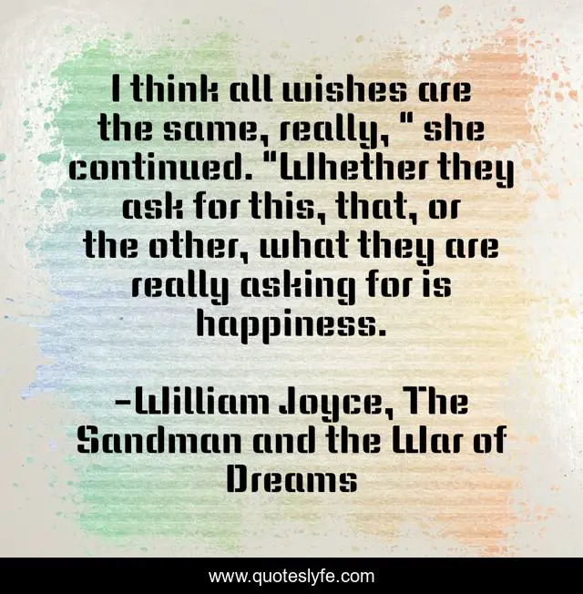 This page presents the quote "I think all wishes are the same, really, " she continued. "Whether they ask for this, that, or the other, what they are really asking for is happiness.". Author of this quote is William Joyce, The Sandman and the War of Dreams. .