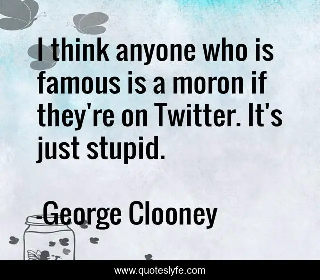 This page presents the quote "I think anyone who is famous is a moron if they're on Twitter. It's just stupid.". Author of this quote is George Clooney. This quote is about moron, stupid, think,.