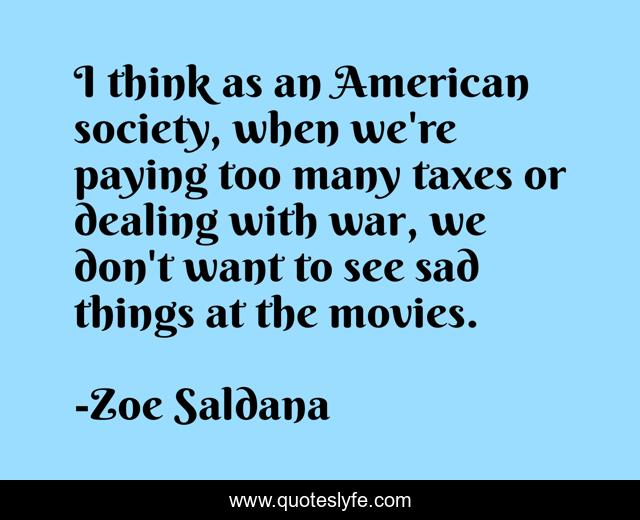 This page presents the quote "I think as an American society, when we're paying too many taxes or dealing with war, we don't want to see sad things at the movies.". Author of this quote is Zoe Saldana. This quote is about society, american, war,.