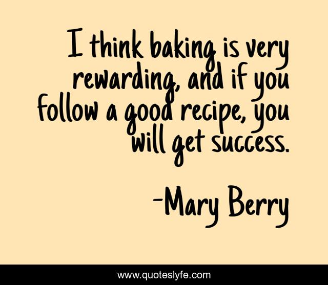 This page presents the quote "I think baking is very rewarding, and if you follow a good recipe, you will get success.". Author of this quote is Mary Berry. This quote is about good, baking, think,.